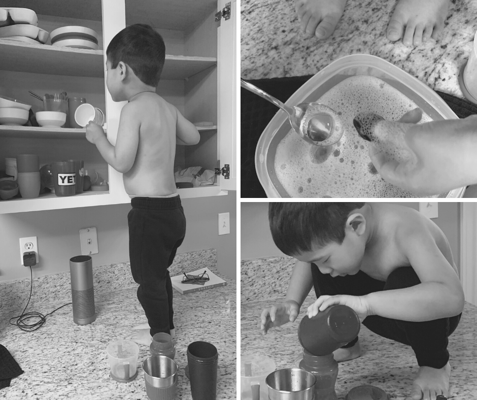 Although I cringed over everything he got out, I sure loved how lit up he was. He eventually spilled so much that water was dripping to the floor. Oh, but the JOY he got from pouring cup after cup and “catching fish” with his spoon was worth the 30 seconds of clean-up.