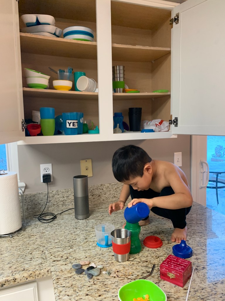 The day I let JeeWoo play with all the soap- and water-filled cups with his dirty, bare feet all over the kitchen counter, I cooked lunch in peace and quiet (AKA not to Cocomelon songs for once!) and he didn’t even fight his nap. Like what?