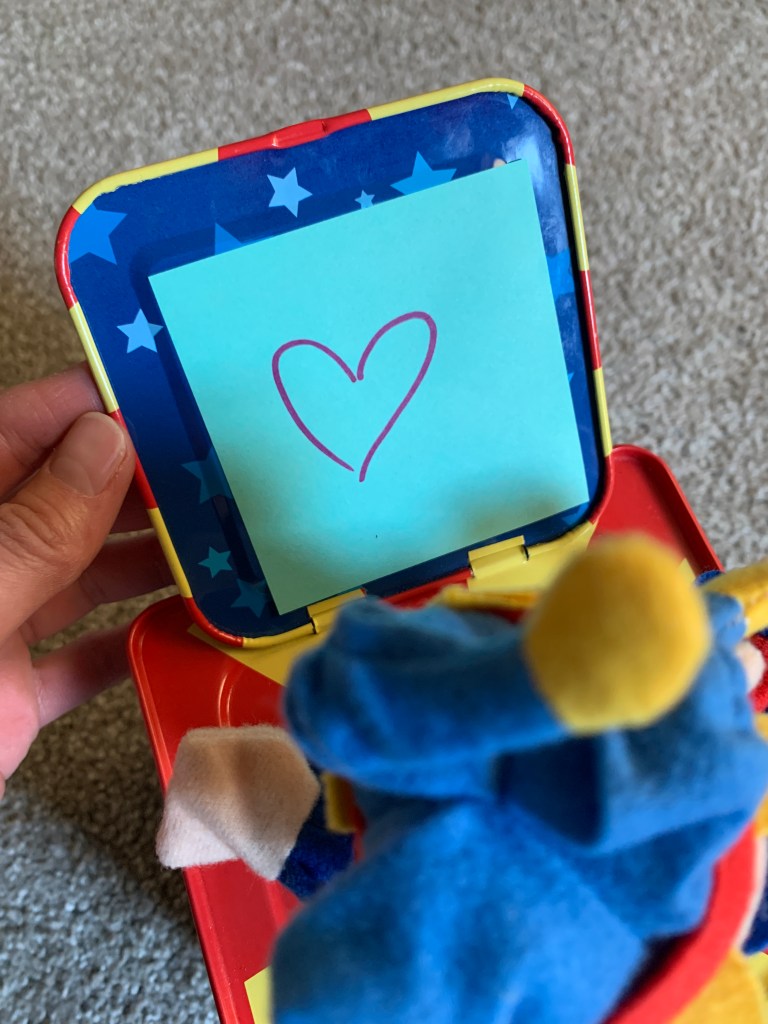 While my 3-foot shadow was napping one day, I drew a heart on five Post-its and placed them around the house. Some were obvious. (Hi, kitchen table + bathroom mirror!). Some were hidden. (Oh hey, tractor scooper and jack-in-the-box lid!)